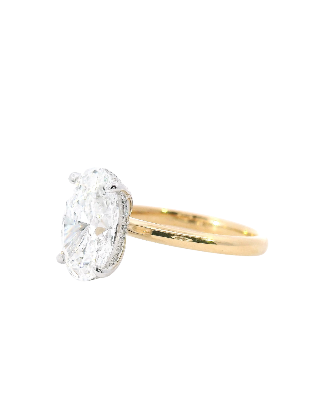 This ring features a 2.68 Carat D VVS2 Oval Cut Lab-Grown Diamond in Parker Classic Solitaire with 0.10cttw Round Brilliant Cut Lab-Grown Diamonds in the Hidden Halo, in 18K Yellow & White Gold.