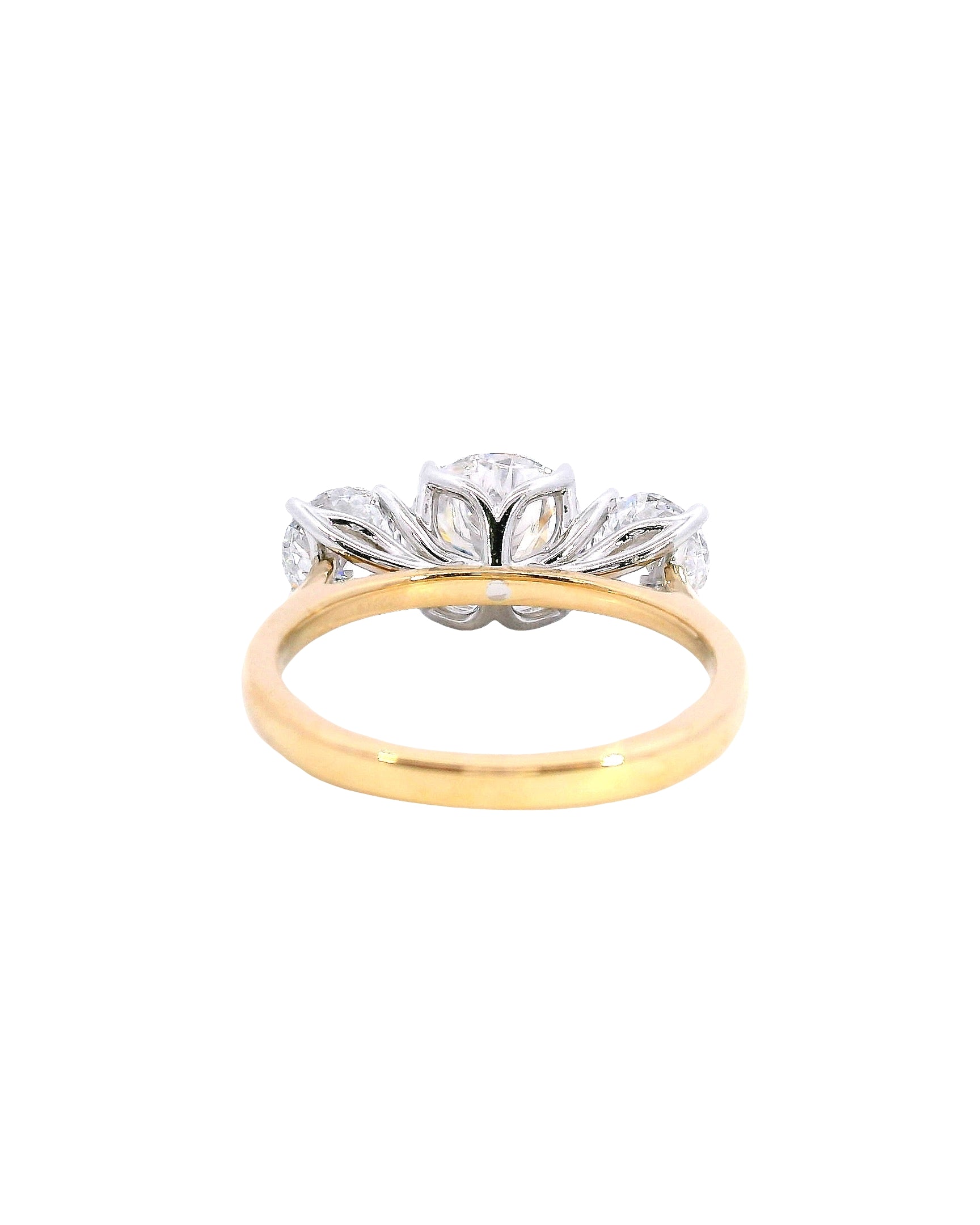 This ring features a 1.76 Carat D VVS2 Round Brilliant Cut Lab-Grown Diamond set in the Trilogy design with 2 x 0.57Ct D VVS1 Round Brilliant Cut Lab-Grown Diamonds on each side, in 18K Yellow and White Gold.