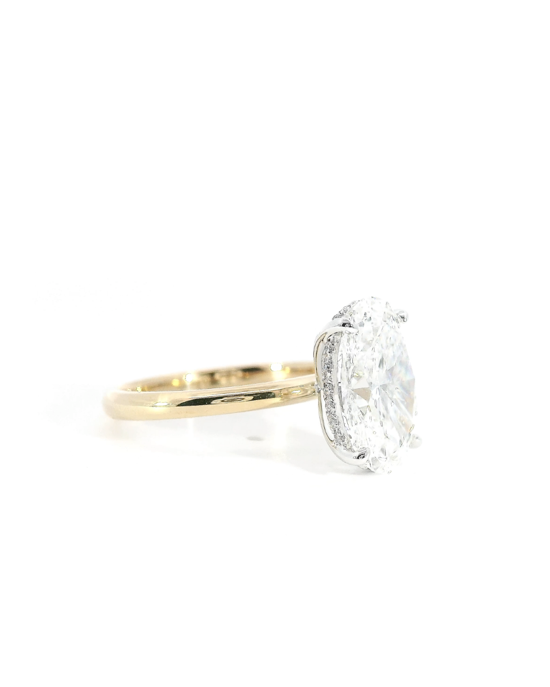 This ring features a 3.07 Carat D VVS2 Oval Cut Lab-Grown Diamond in Parker Classic Solitaire with 0.10cttw Round Brilliant Cut Lab-Grown Diamonds in the Hidden Halo, in 18K Yellow & White Gold.