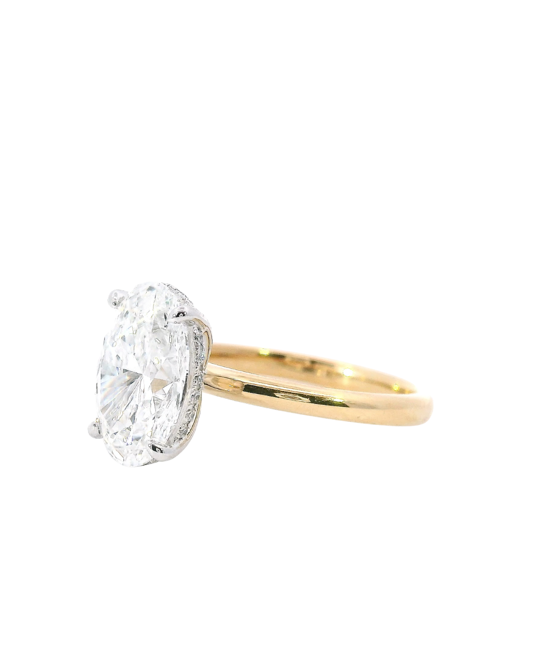 This ring features a 3.34 Carat D VVS2 Oval Cut Lab-Grown Diamond in Parker Classic Solitaire with 0.10cttw Round Brilliant Cut Lab-Grown Diamonds in the Hidden Halo, in 18K Yellow & White Gold.