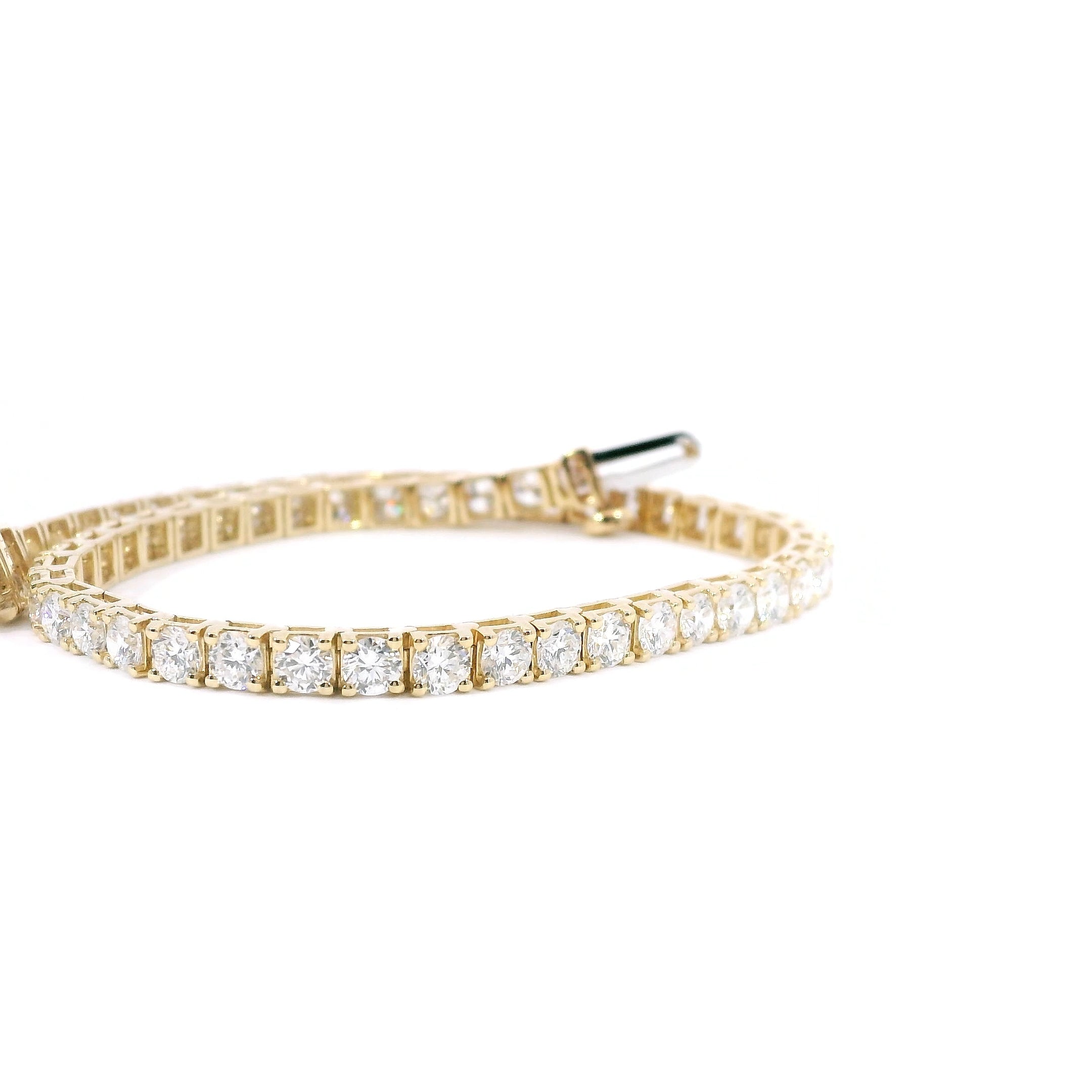 This Tennis Bracelet features 5.28Ct Total Diamond Weight E/F VS+ Round Brilliant Cut Classic Set Lab-Grown Diamonds, in 18K Yellow Gold.
