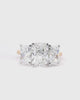 Our Trilogy Design is thoughtfully proportioned to enhance your main Diamond. Three diamonds traditionally represent your past, present and future as a couple; a touch of classic symbolism reimagined with our modern designs. The Trilogy design has been artfully made in an open style setting, allowing ample light to move through each diamond and maximise brilliance. Each diamond is set with a hidden diamond halo and secured with thin, dainty cats claws.